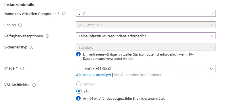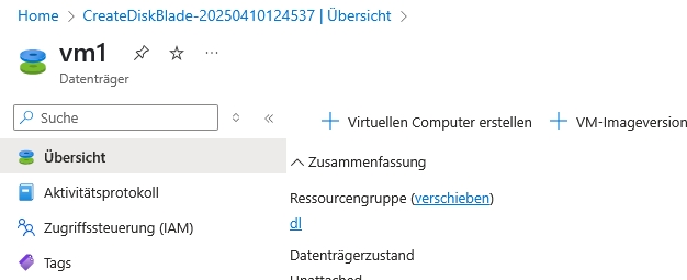 Sobald der Datenträger erstellt ist gehen Sie in diese Ressource und klicken auf "Virtuellen Computer erstellen". Als Image erscheint dann der Datenträger und damit die Betriebssystemfestplatte.