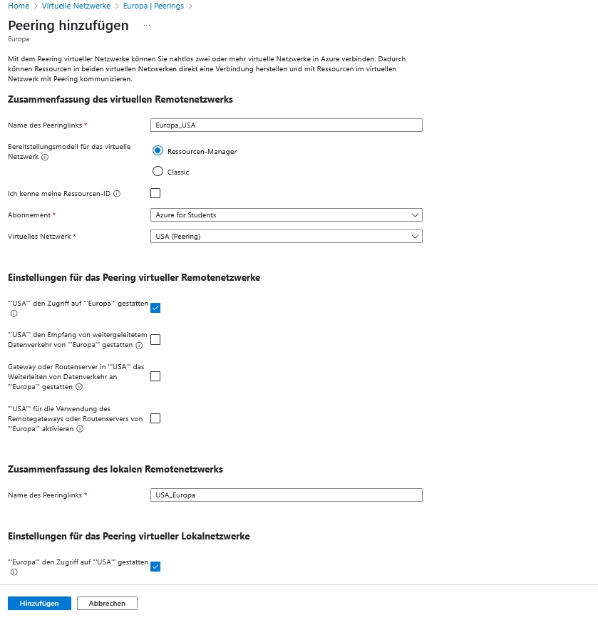 Fügen Sie ein Peering hinzu. Geben Sie hier einen Namen für die Hin- und einen Namen für Rückverbindung an. Sie müssen ebenfalls das andere virtuelle Netzwerk angeben. Nach dem Anlegen drücken Sie Aktualisieren, bis das Peering "Connected" ist.