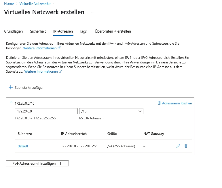 Das VNet soll den Adressraum 172.20.0.0/16 mit dem Subnetz default 172.20.0.0/24 haben.