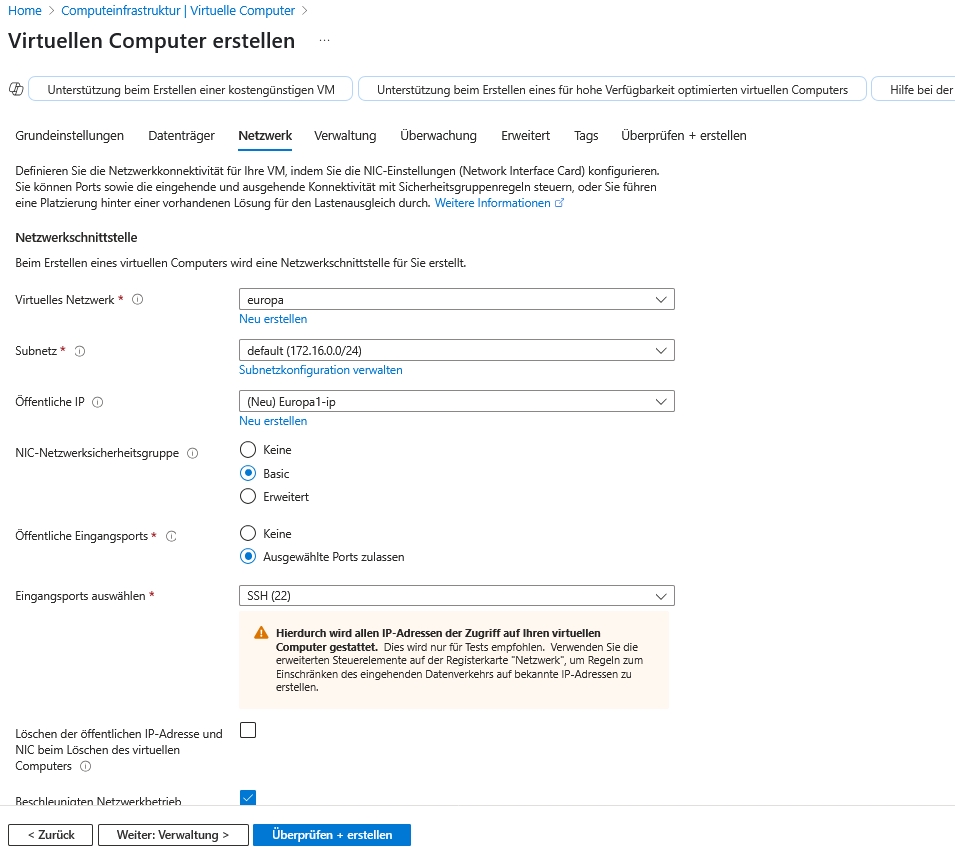 Unter Netzwerk weisen Sie der Netzwerkschnittstelle das Netzwerk Europa und das Subnetz default zu, wenn dieses nicht schon ausgewählt ist. Wenn hier keines der zuvor angelegten Netze auftaucht, haben Sie sich in der Region der VM verklickt.