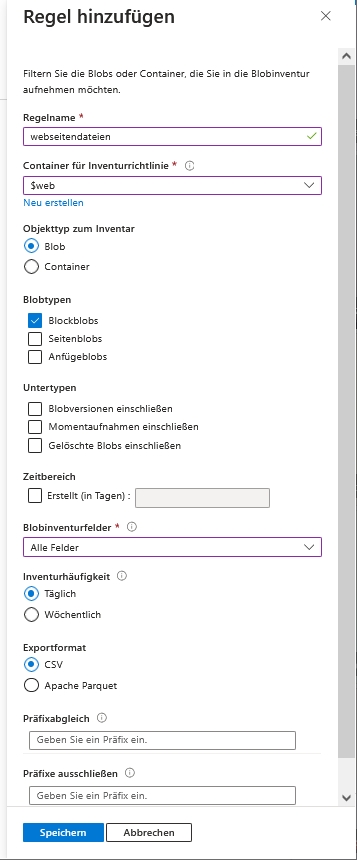 - Wählen Sie hier Blockblobs aus und auch Täglich bei der Inventurhäufigkeit. Anschließend klicken Sie auf "Speichern".