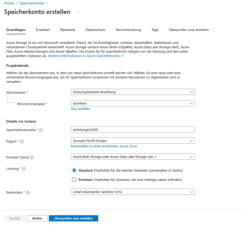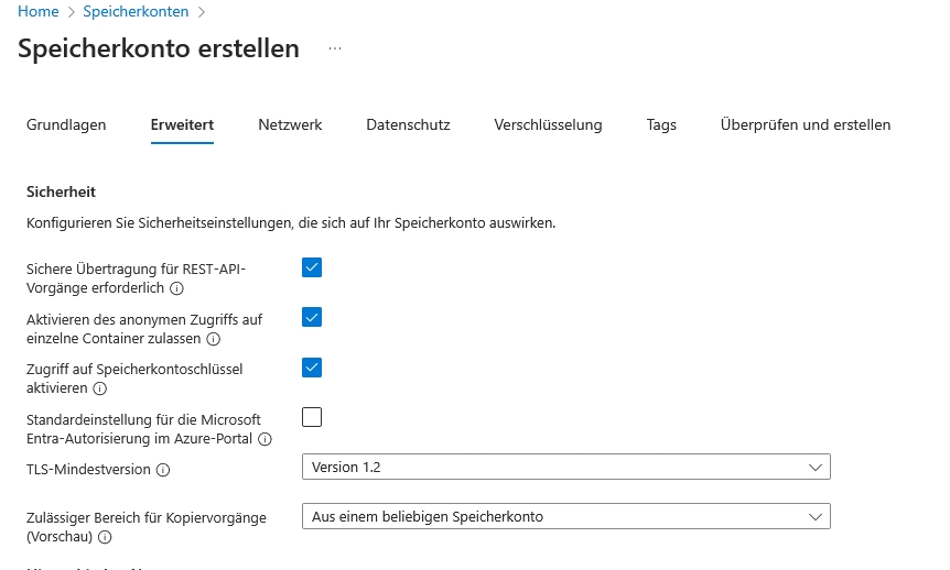 Erstellen Sie ein neues Speicherkonto. Wählen Sie unter "Erweitert" den anonymen Zugriff aus.