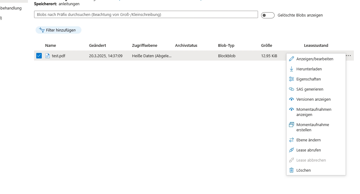 Erstellen Sie ein Speicherkonto mit anonymen Zugriff. Laden Sie diese Test.pdf-Datei in einen Container mit der Zugriffsebene "Anonymer Lesezugriff nur für Blobs" hoch (Am besten mit rechter Maustaste und "Ziel speichern unter..." runterladen.).