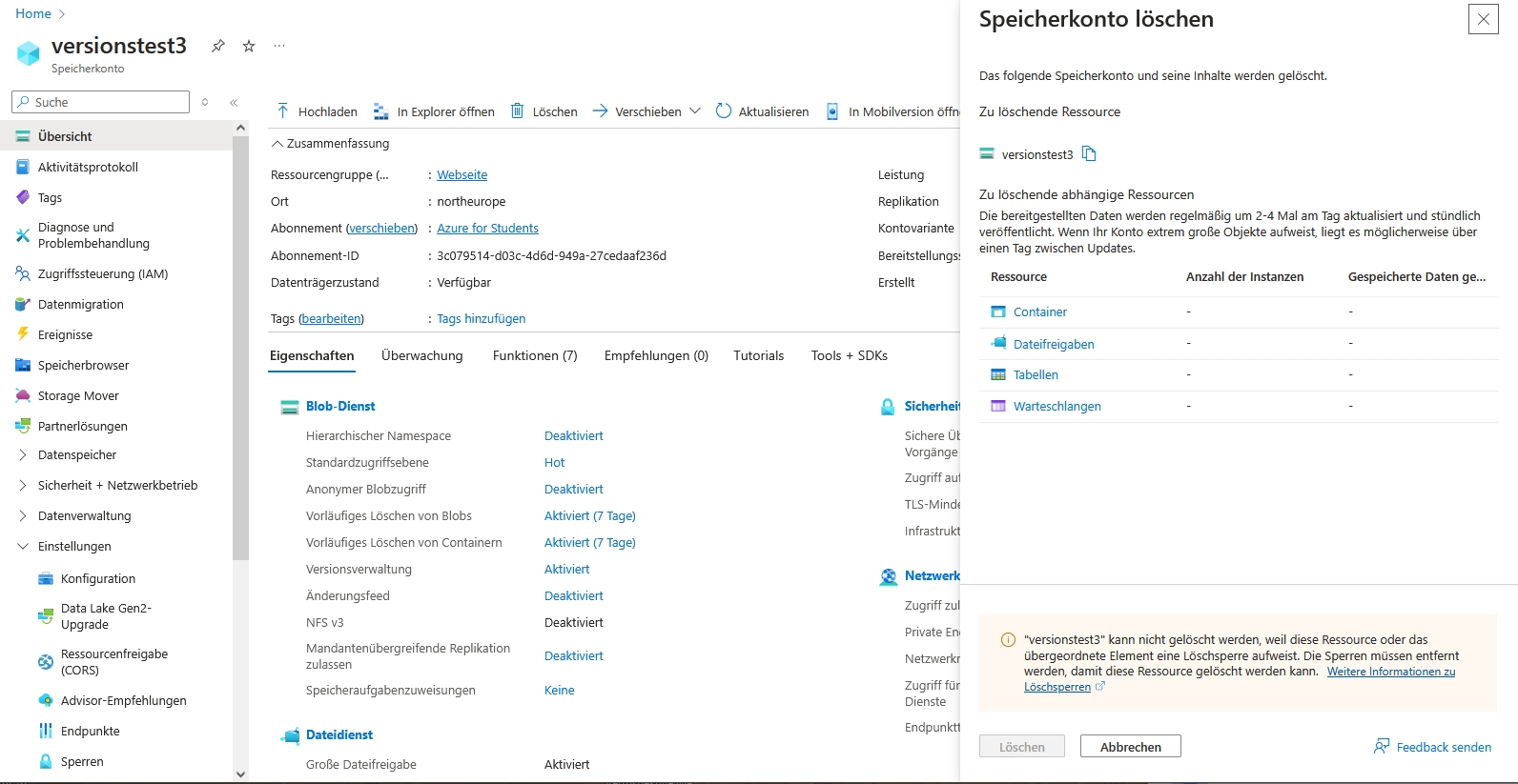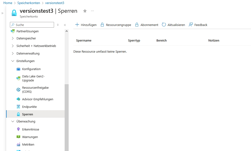 - Sobald die Sperre aktiv ist (das sieht man am Status der Änderung unter der Klocke) versuchen Sie einmal das ganze Speicherkonto zu löschen. Dies sollte nicht möglich sein.