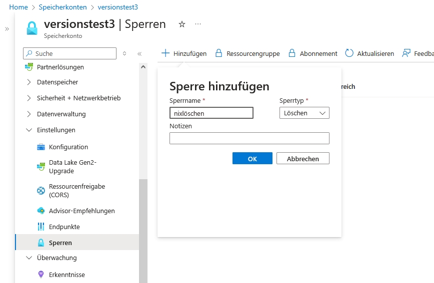 Versehen Sie ein Speicherkonten mit einer Sperre vom Typ "Löschen".