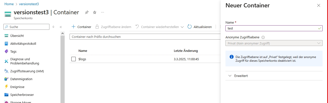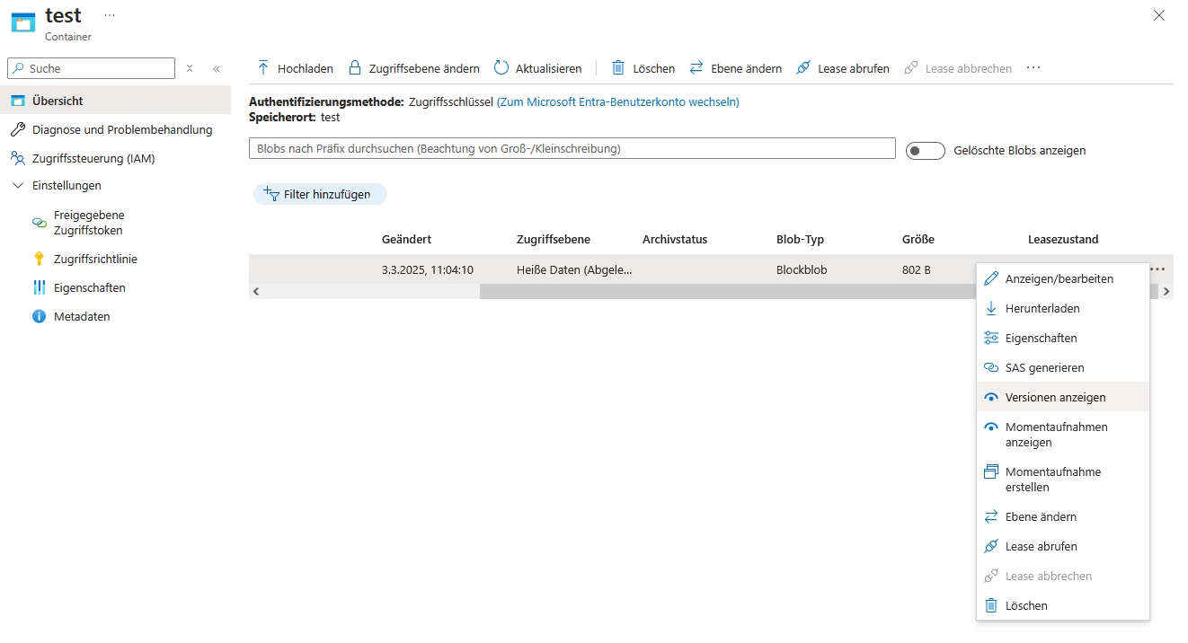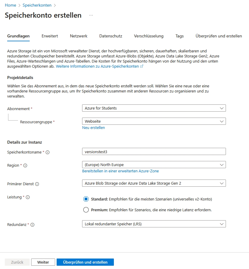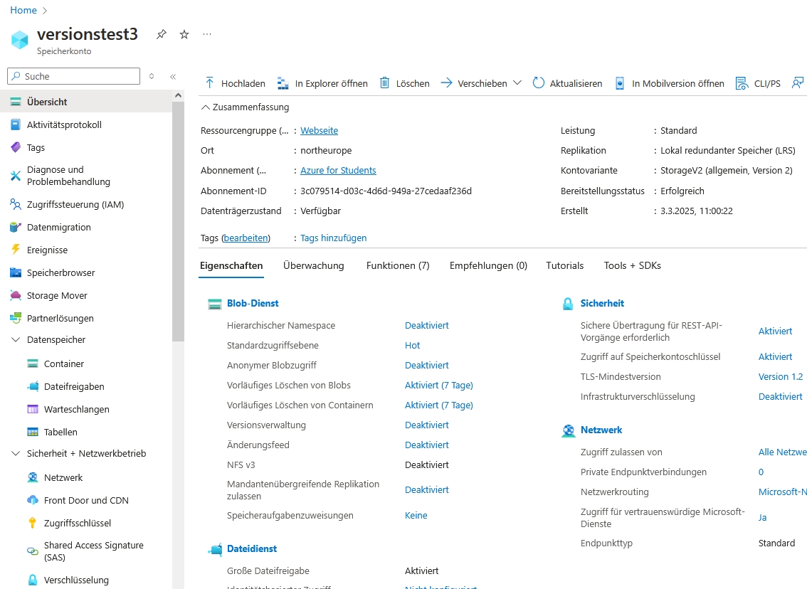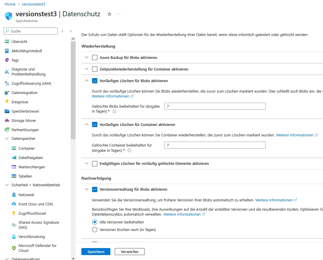 Erstellen Sie ein Speicherkonten welches "Vorläufiges Löschen für Blobs aktivieren" und "Versionsverwaltung für Blobs aktivieren" ausgewählt hat.