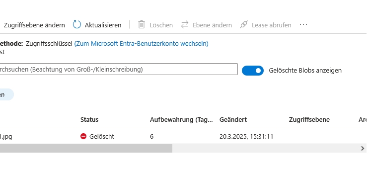 Löschen Sie einmal eine Datei komplett. Mit dem Regler "Gelöschte Blobs anzeigen" können Sie sich den "Papierkorb" ansehen.