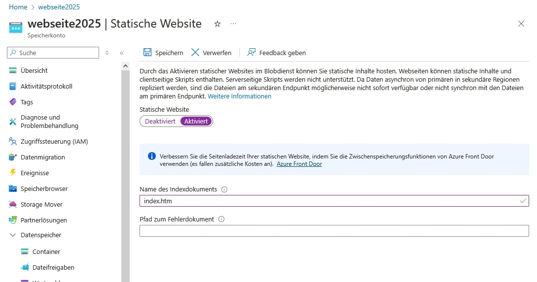 In der Übersicht klicken Sie dann unter Funktionen auf Statische Webseite. Geben Sie index.htm als Indexdokument an und speichern Sie. Kopieren Sie sich hier den Primären Endpunkt in Ihre Zwischenablage.