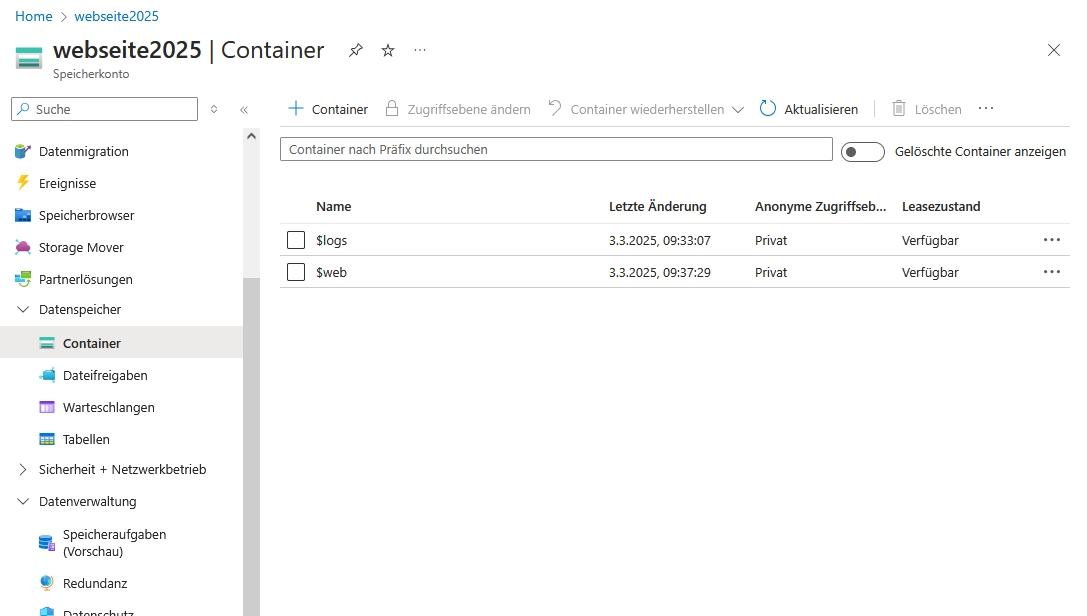 Es wird ein neuer Container $web angelegt. Laden Sie hier diese index.htm hoch. Am besten mit rechter Maustaste und "Ziel speichern unter..." runterladen.