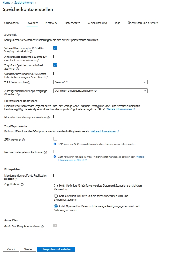 Erstellen Sie ein neues Speicherkonto. Wählen Sie hier unter "Erweitert" die Zugriffsebene Cold aus.