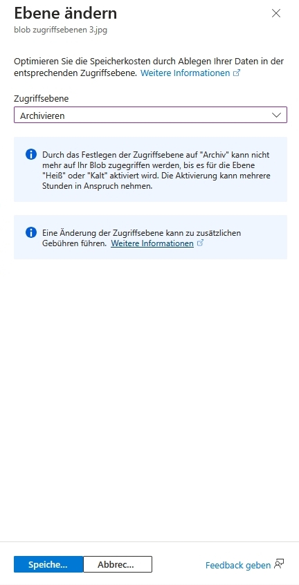 Verschieben Sie eine Datei in die Speicherebene Archiv, nachdem diese vorher hochgeladen wurden. Es ist nur bestehende Dateien in Archiv zu verschieben und keine Dateien hochzuladen, die gleich in der Speicherebene Archiv gespeichert werden.