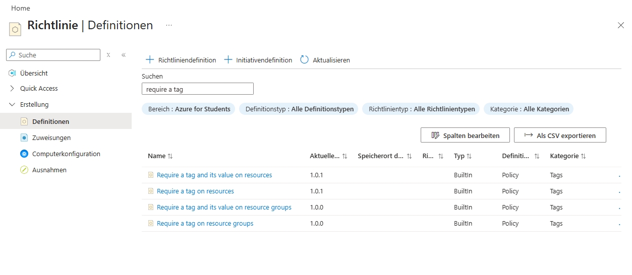 Gehen Sie auf "Richtlinie" im Azure-Portel und danach auf Erstellung / Definition.
