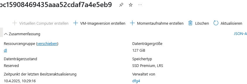 Sobald der Datenträger erstellt ist gehen Sie in diese Ressource und klicken auf "Virtuellen Computer erstellen". Als Image erscheint dann der Datenträger und damit die Betriebssystemfestplatte.
