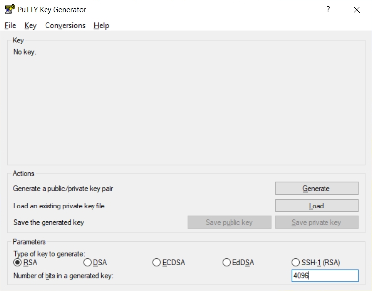 Wählen Sie RSA und 4096 bits aus und klicken auf "Generate". Bewegen Sie Maus!