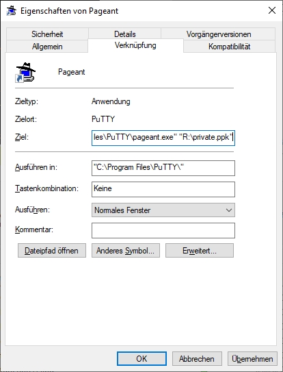 - gehen Sie in die Eigenschaften (rechte Maustaste Eigenschaften) der Verknüpfung. Hier ergänzen Sie unter Ziel den Speicherort Ihrer privaten Keydatei.