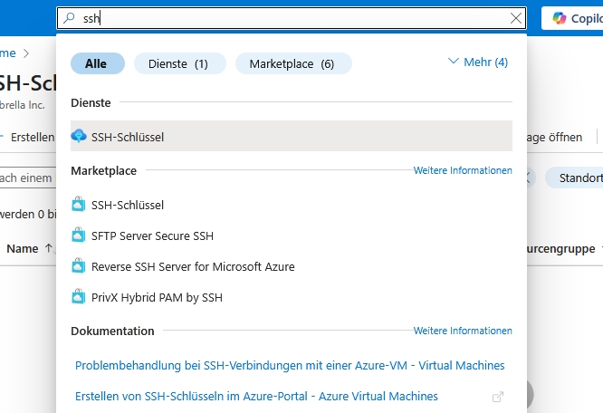Gehen Sie nun in Azure auf "SSH-Schlüssel". Suchen Sie dazu einfach nach "SSH" in der Azure-Suche.
