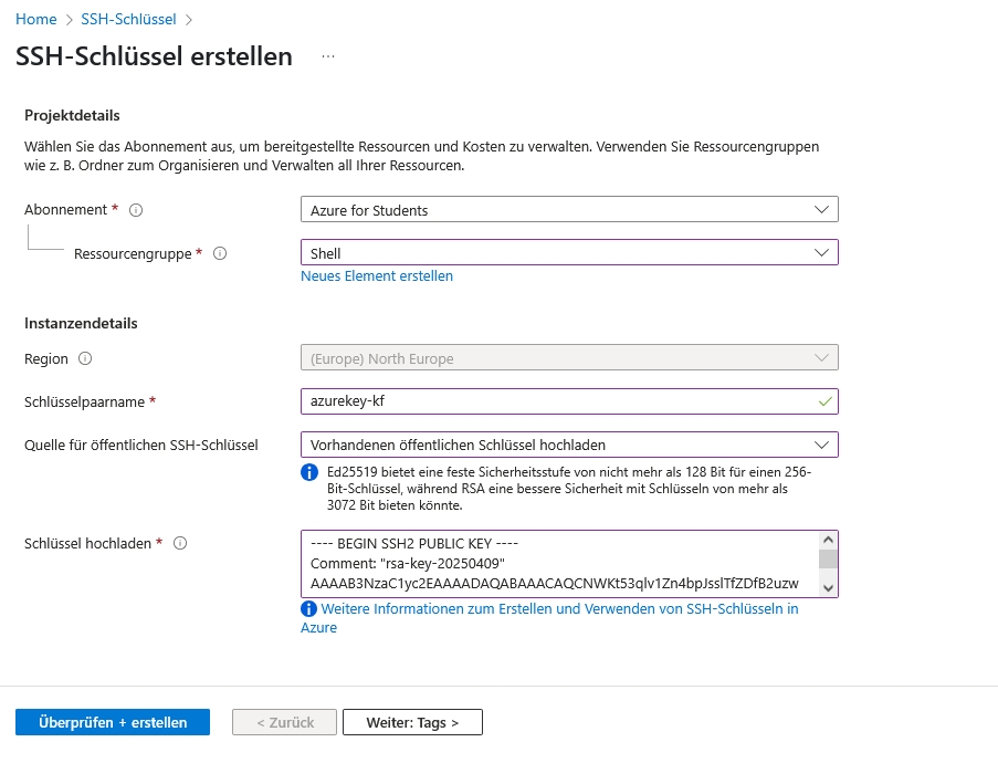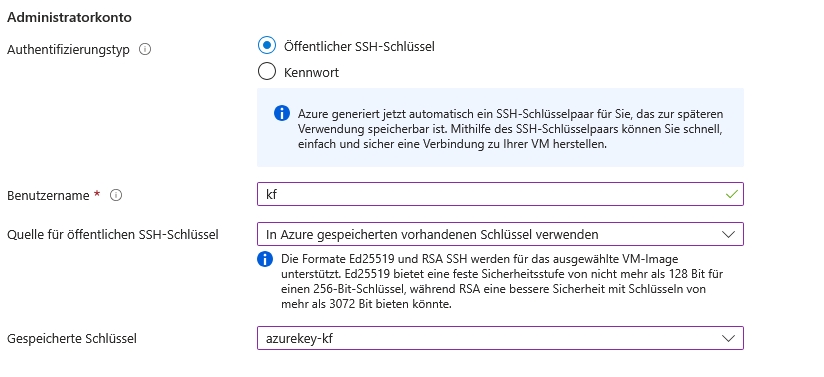 Nach dem Erstellen können Sie bei jeder neuen VM einfach bei Authentifizierungstyp "Öffentlicher SSH-Schlüssel" angeben.