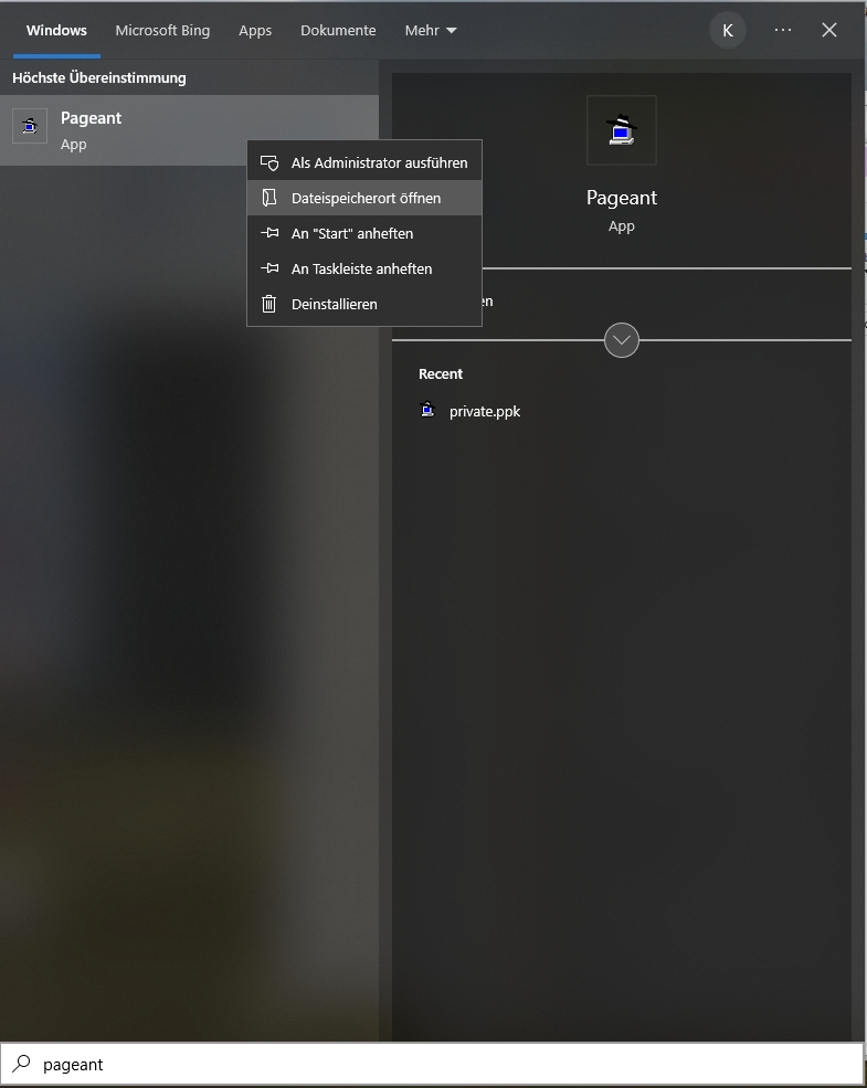 Geben Sie in der Windows-Suche "pageant" ein. Rechtsklicken Sie auf den gefundenen Eintrag und wählen Sie "Dateispeicherort öffnen" aus.