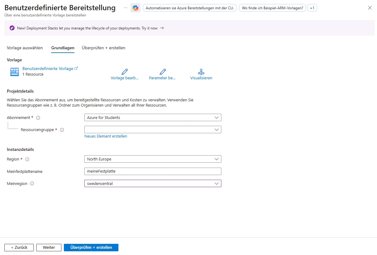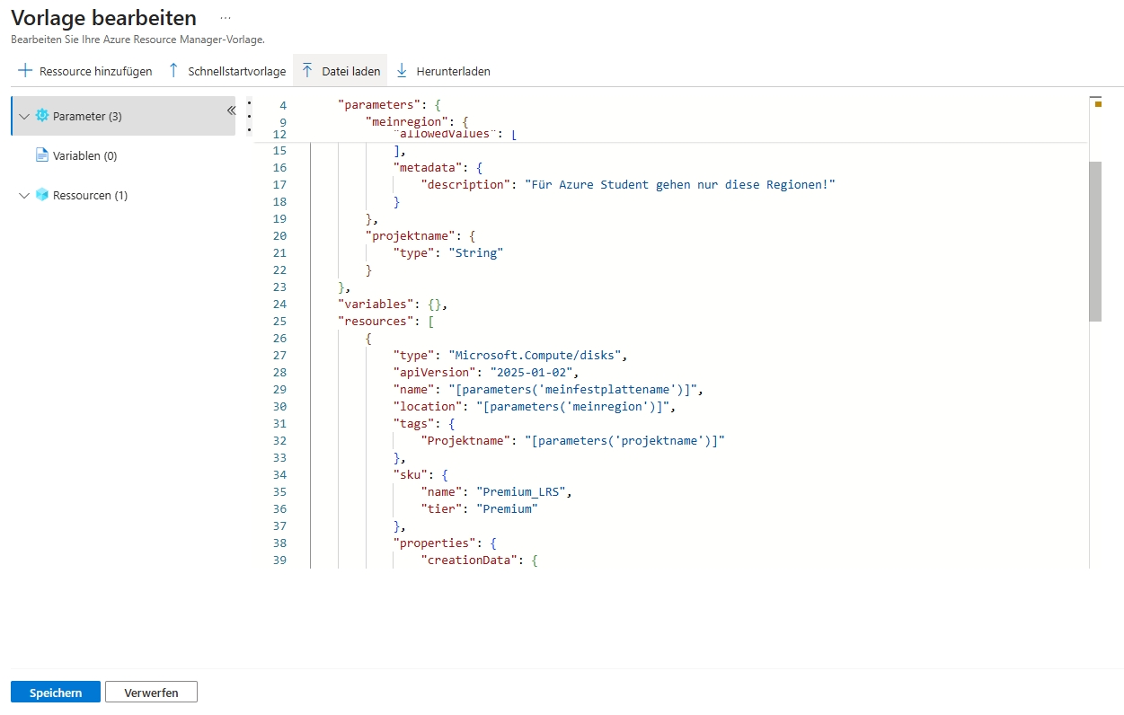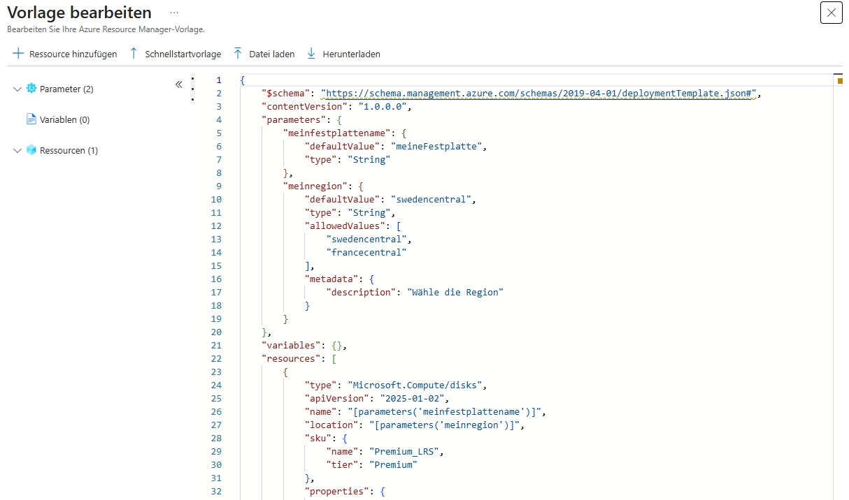 - Da es leider oft zu Tippfehlern bei der Eingabe der Region kommt, möchten wir für die Region ein Auswahlfeld erstellen. Ändern Sie die Vorlage so ab, dass man zwischen swedencentral und francecentral per Pulldownmenü auswählen kann.