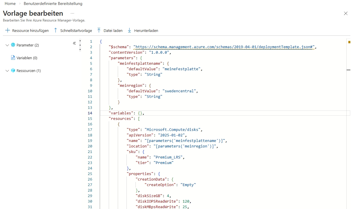 Unten muss dann ebenfalls die Zeile "location": "swedencentral", angepasst werden.