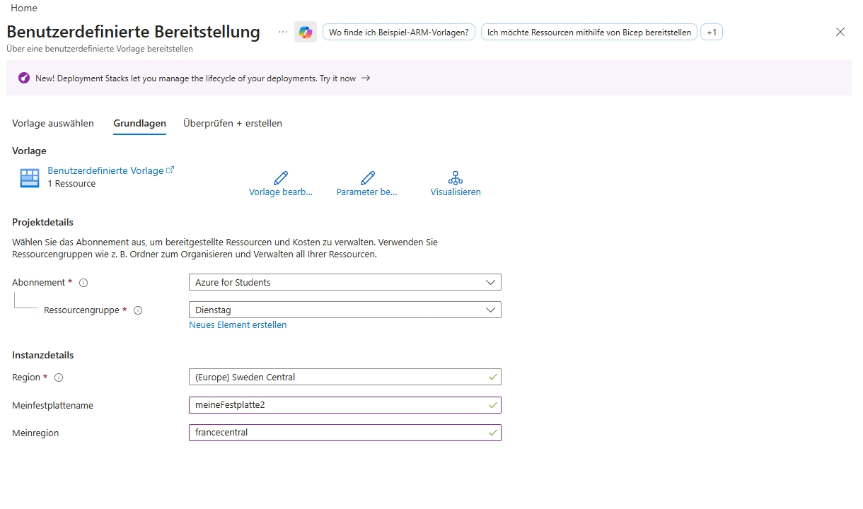 In der ARM Vorlage ist die Region fest einprogrammiert. Diese soll beim Anlegen änderbar sein.