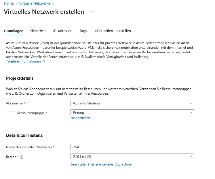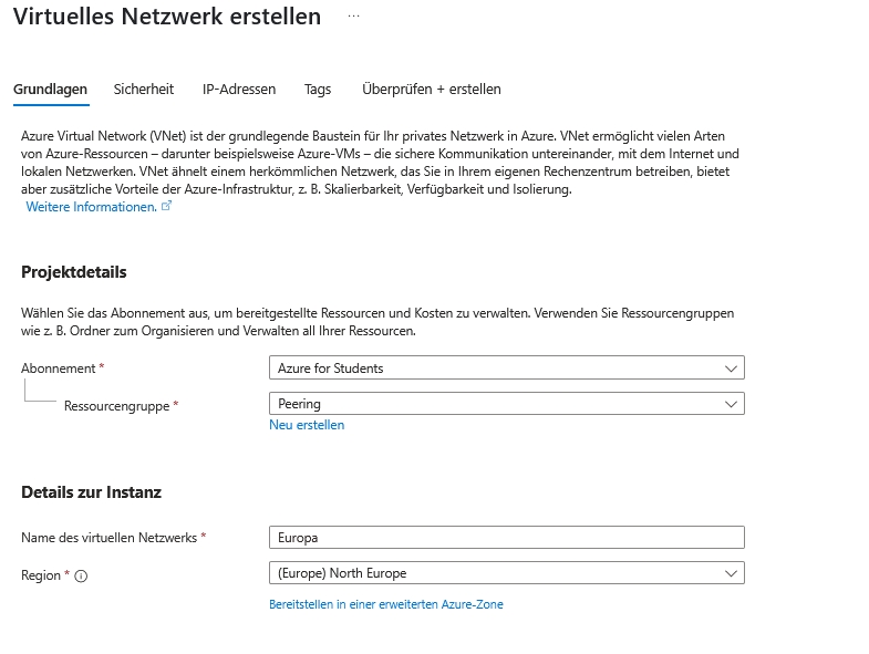 Legen Sie hierzu am besten eine Ressourcengruppe "Peering" an.