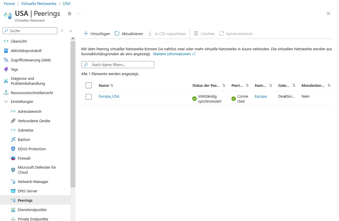 Das Peering taucht nun in beiden VNets im Menüpunkt Peerings auf.