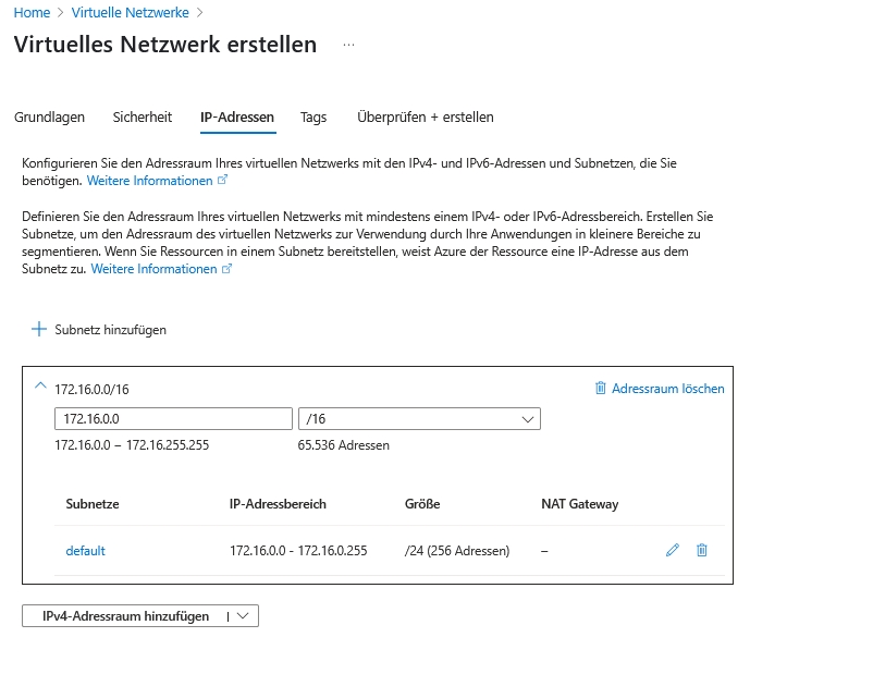 Das VNet soll den Adressraum 172.16.0.0/16 mit dem Subnetz default 172.16.0.0/24 haben.