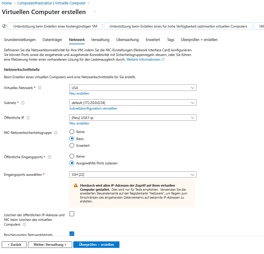 Unter Netzwerk weisen Sie der Netzwerkschnittstelle das Netzwerk Europa und das Subnetz default zu, wenn dieses nicht schon ausgewählt ist. Wenn hier keines der zuvor angelegten Netze auftaucht, haben Sie sich in der Region der VM verklickt.