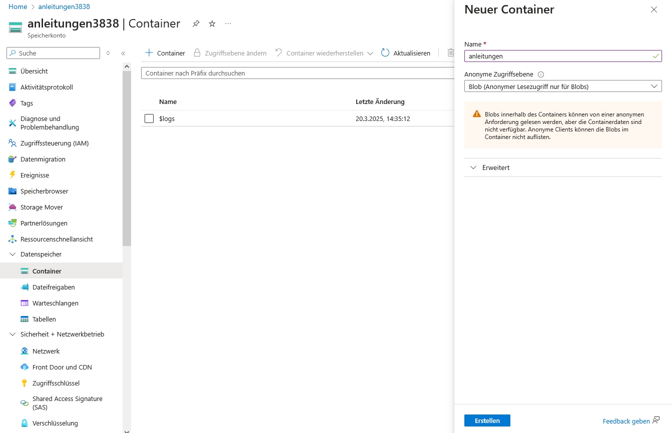 Erstellen Sie ein neues Speicherkonto. Wählen Sie unter "Erweitert" den anonymen Zugriff aus.