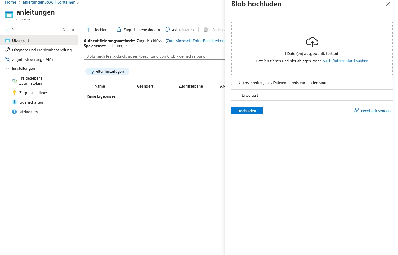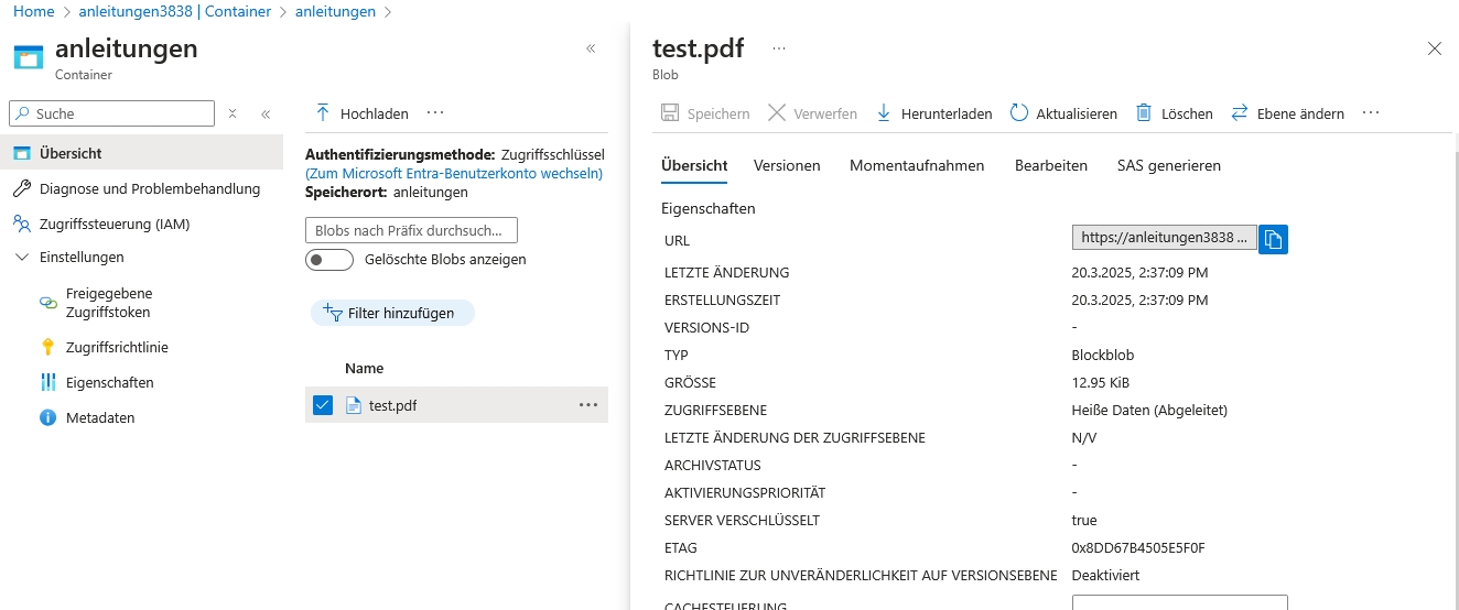 Erstellen Sie ein Speicherkonto mit anonymen Zugriff. Laden Sie diese Test.pdf-Datei in einen Container mit der Zugriffsebene "Anonymer Lesezugriff nur für Blobs" hoch (Am besten mit rechter Maustaste und "Ziel speichern unter..." runterladen.).