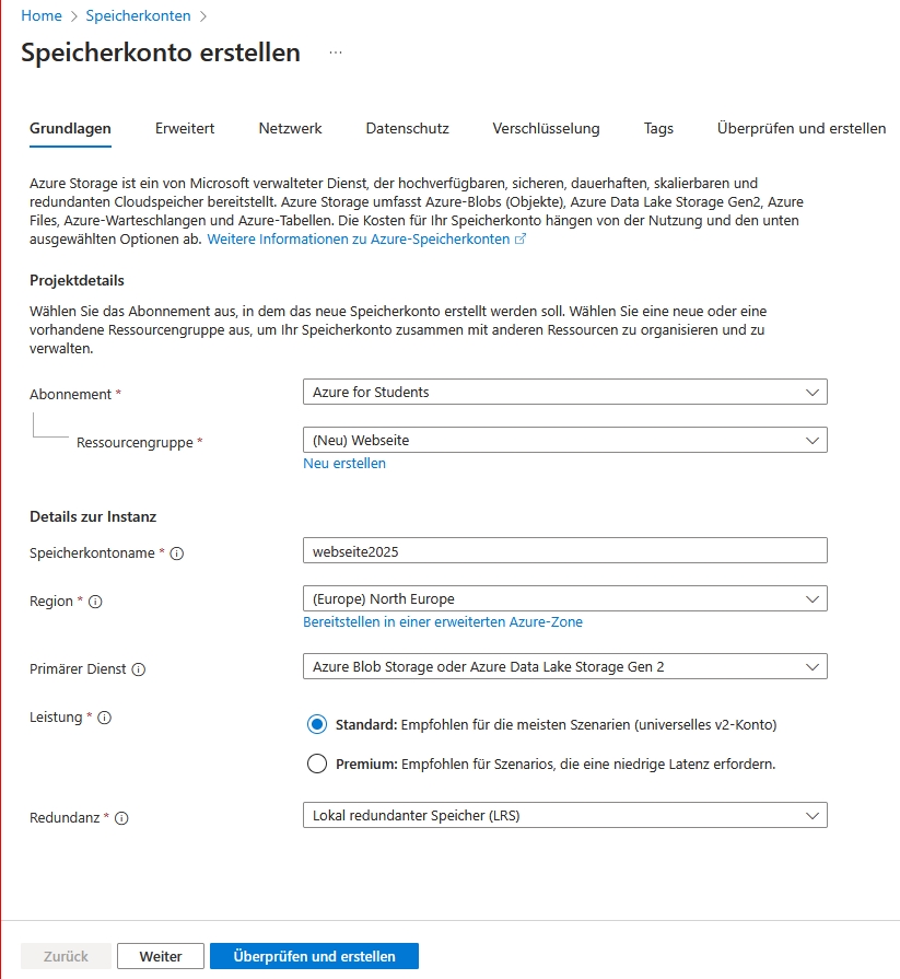 Erstellen Sie ein neues Speicherkonto mit einem passenden Namen. Der primäre Dienst ist Azure Blob Storage. Standard und LRS reicht zum testen aus.