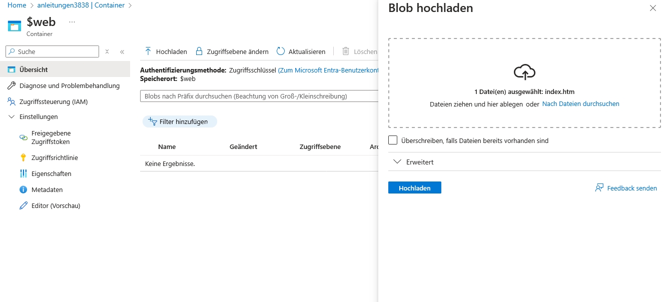 Es wird ein neuer Container $web angelegt. Laden Sie hier diese index.htm hoch. Am besten mit rechter Maustaste und "Ziel speichern unter..." runterladen.
