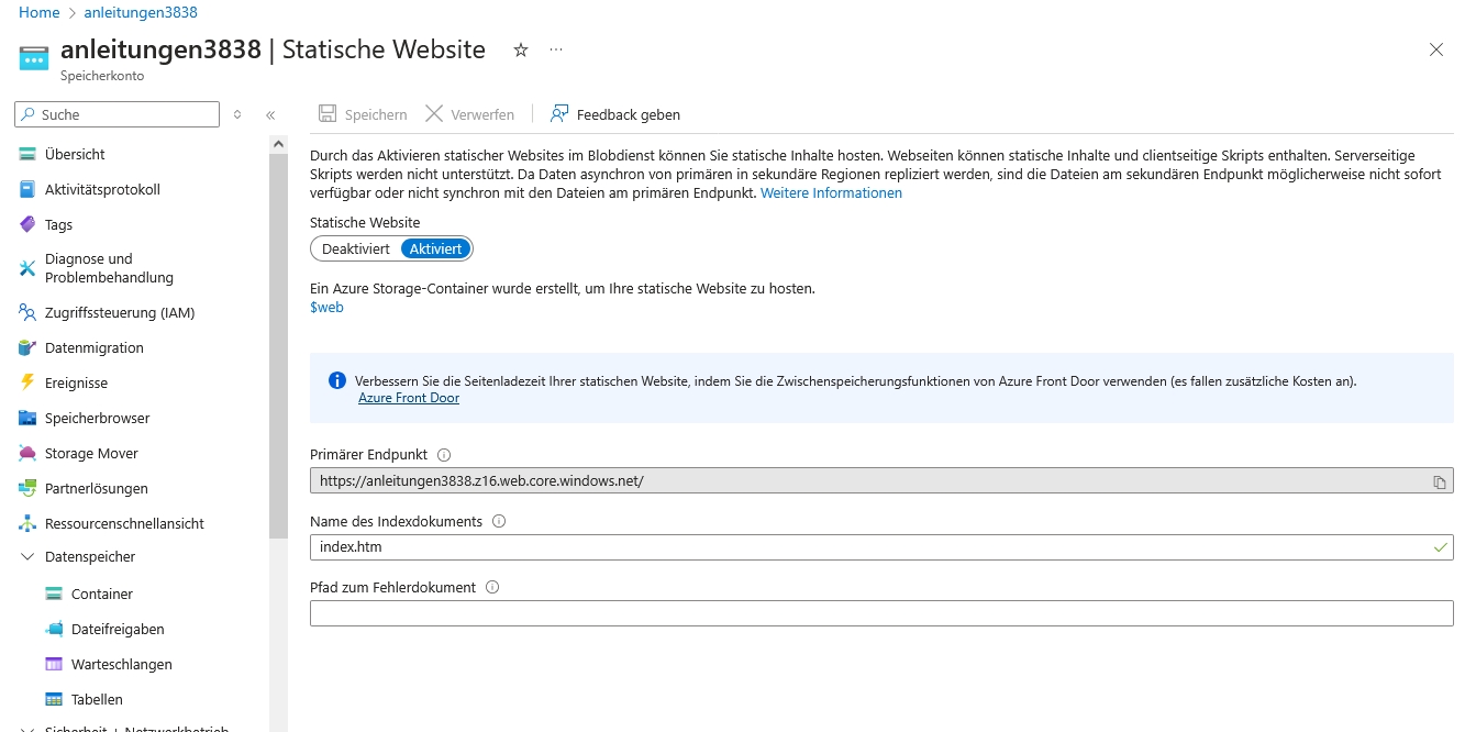 In der Übersicht klicken Sie dann unter Funktionen auf Statische Webseite. Geben Sie index.htm als Indexdokument an und speichern Sie. Kopieren Sie sich hier den Primären Endpunkt in Ihre Zwischenablage.