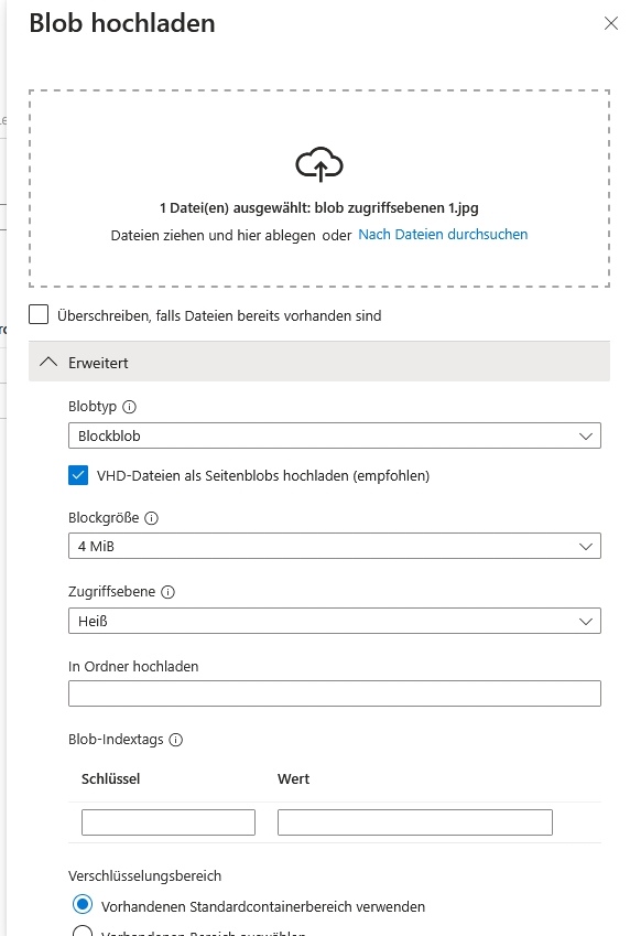 Es soll bei einem Speicherkonto Kosten eingespart werden. Dabei soll verhindert werden, dass User es vergessen die Speicherebene Cold beim Upload anzugeben. Es soll aber weiterhin möglich sein, einzelne Dateien in der Speicherebene Heiss abzulegen.