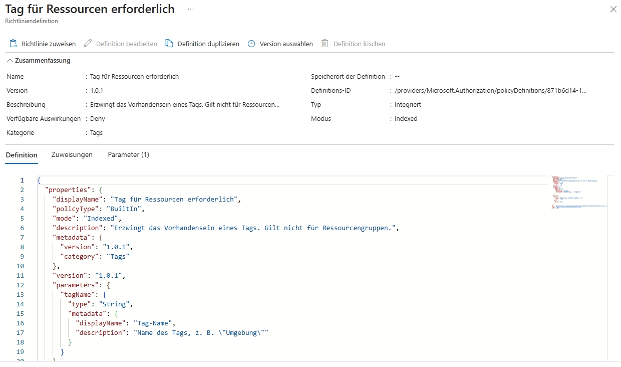 Gehen Sie auf "Richtlinie" im Azure-Portel und danach auf Erstellung / Definition.