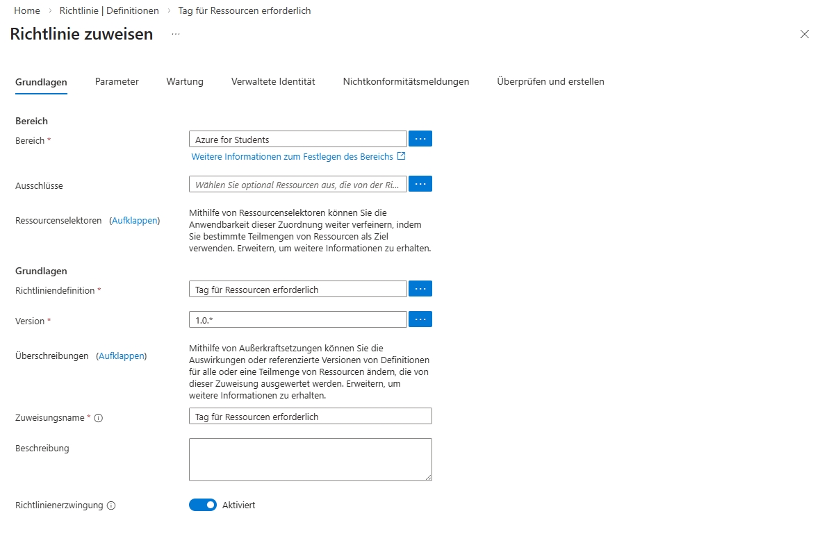 Testen Sie das Anlegen einer neuen Resource (keine Rsourcengruppe, z.B. ein VNet) ohne Tag. Es gibt einen Fehler. Fügen Sie dann unter Tags den Tag hinzu. Leider gibt es den Hinweis nur hier auf dem Tags Reiter.