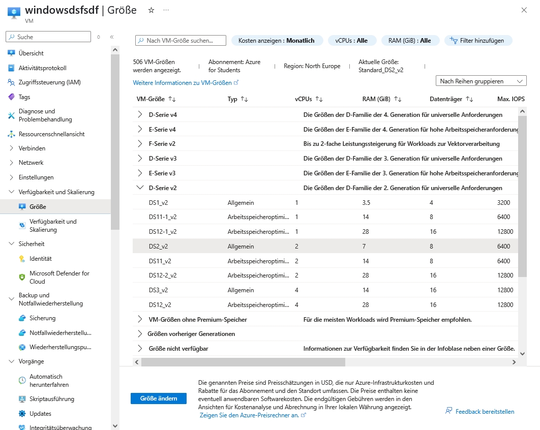 - Unter "Verfügbarkeit und Skalierung / Größe" ändern Sie die Größe z.B. auf DS2_v2.
