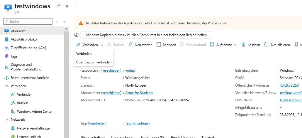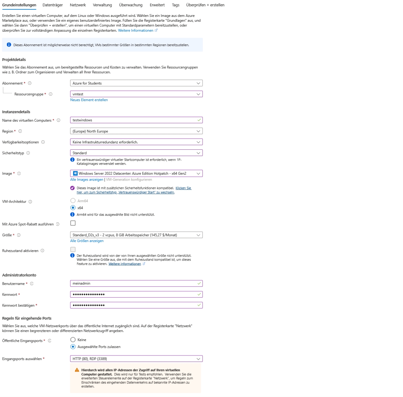 Erstellen Sie eine neue Ressourcegruppe mit Windows-VM. Geben Sie hier einen Benutzernamen und Kennwort ein, welches Sie sich merken/notieren. Die Eingangsports 3389 und 80 sind offen. Unter Netzwerk müssen Sie eine öffentliche IP erstellen.