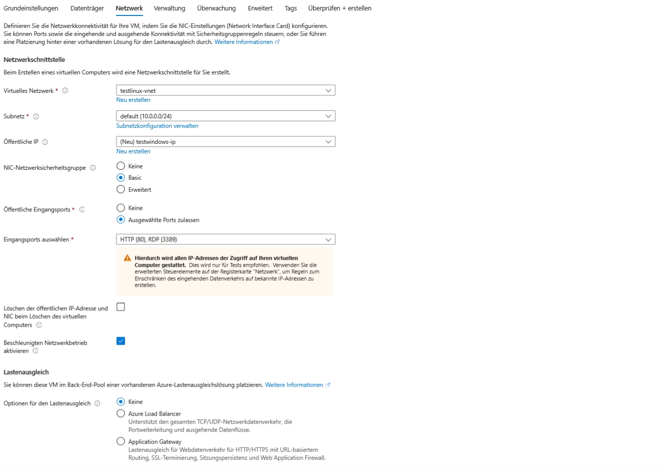 Erstellen Sie eine Windows-VM mit öffentlicher IP-Adresse, offenen Ports 3389 und 80 und installieren Sie auf dieser den Webserver IIS mit einer Test-HTML-Seite.