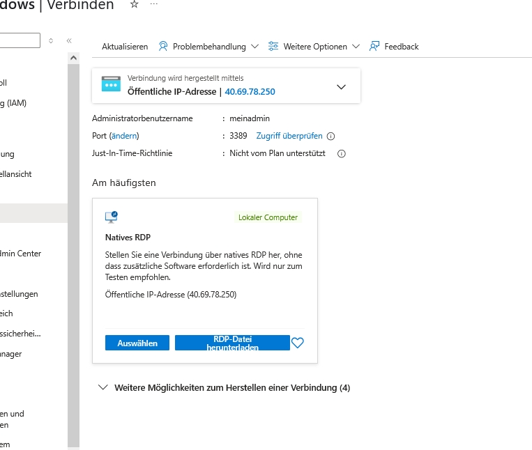 Nach dem erfolgreichen Anlegen gehen Sie unter Verbinden auf "RDP-Datei herunterladen". Speichern diese Datei auf ihrem Desktop